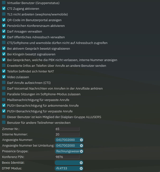 - Dieser Benutzer ist kein Mitglied der Dialplan-Gruppe ALLUSERS: Mit dieser Option können Sie ein Telefon von der Gruppe ALLUSERS ausschliessen. Das bedeutet: falls Sie irgendwo im Dialplan konfigurieren, dass es bei ALLUSERS klingeln soll, so klingelt es überall, ausser bei denjenigen Telefonen, bei welchen diese Option aktiviert wurde.