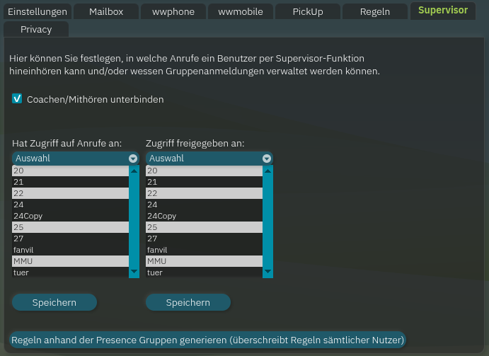 Hier können Sie festlegen, in welche Anrufe ein Benutzer per Supervisor-Funktion hineinhören kann.